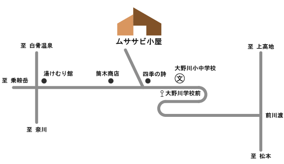 乗鞍高原方面行きのバスに乗り「大野川学校前」にて下車、徒歩5分。