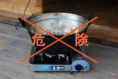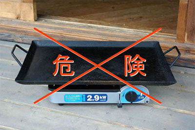 ガスカートリッジの上に鍋や鉄板があると反射熱によってガスカートリッジ(ボンベ)が熱せられ爆発します!(事故例あり)